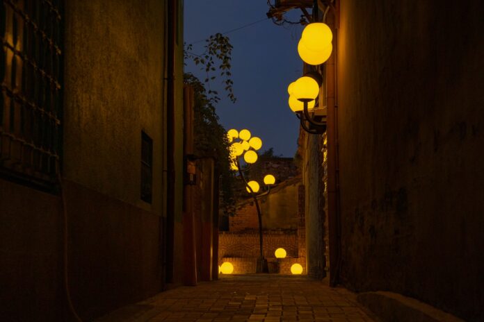 擅長雕塑和空間裝置的藝術家石孟鑫,常以生活物件拼裝、變形,活用畸零空間,讓物件和空間產生對話。石孟鑫說,這次在魚鱗巷展出《路燈樹》,靈感來自鹽水早年倒風內海的潮汐與風勢,讓許多路樹在歲月中傾斜生長。作品將臺灣家戶常見的黃色門柱燈變形,模擬路樹傾斜生長的姿態,從街角的空隙中伸展,像是在訴說一段被海風推動過的身體記憶。小型的黃球燈則從牆面縫隙與殘痕中生長出來,像是光的果實,在夜間用柔和的光暈染魚鱗巷,讓老巷弄更加迷人。