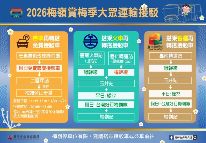 台南市楠西梅區嶺梅花盛開綻放,隨著花朵大量綻放遊客將持續增加,為紓解大量車潮湧入梅嶺山區,交通局將於兩個週末假日(114年1月17日、18日、24日及25日)規劃免費接駁車,呼籲自行開車民眾可將車輛停放於原「芒果農創玫瑰綠柏園」停車場(位於楠西區水庫路9號,台3線旁)再搭乘免費接駁車上山,同時鼓勵民眾多使用大台南公車,可從台南、善化搭綠幹線、橘幹線至玉井轉運站,再轉乘台灣好行梅嶺線(假日18班)或綠22(平日8班)前往梅嶺地區。
