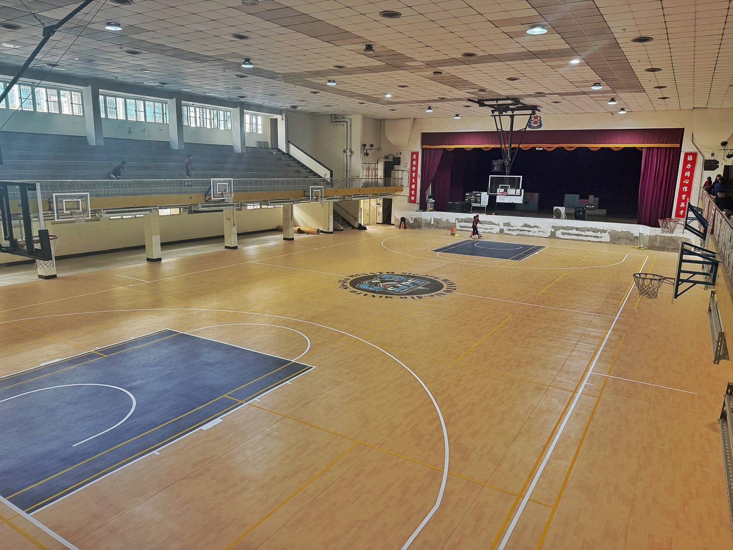協進國小協進館長期作為校內體育教學、籃球訓練及各項活動的重要場地,惟原有地板歷經多年使用已明顯老化,影響運動安全與使用品質。此次地面更新工程採用具備良好彈性、防滑與吸震效果的PVC運動地墊,相較原本硬質木質地板,更能有效保護學童與選手的關節與身體,全面提升運動安全性與舒適度。