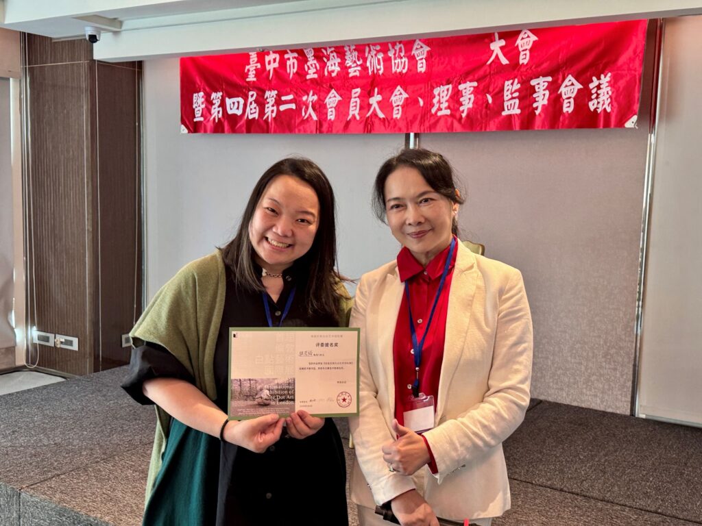 藝術家張若綺(左)獲頒倫敦首屆白點藝術國際展評審委員提名獎,開心與廖迎晰理事長合影。(圖:墨海藝術協會提供)