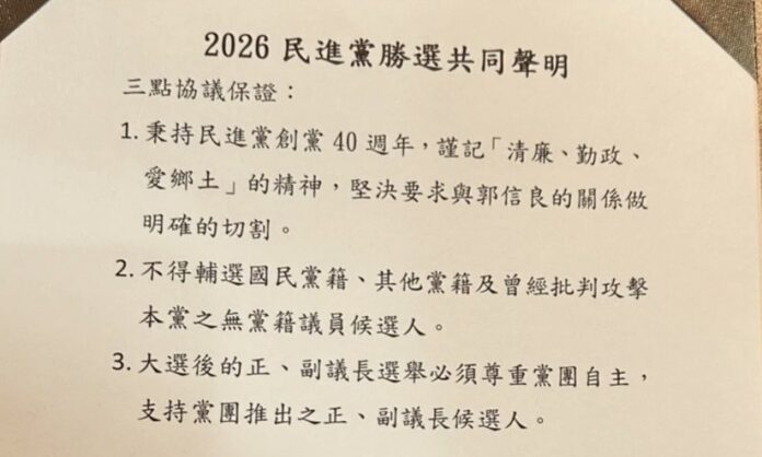 台南市議會民進黨團向陳亭妃提出「民進黨勝選共同聲明」3點協議保證要求,第一點:「秉持民進黨創黨40周年精神,謹守清廉、勤政、愛鄉土的精神,堅決要求與郭信良的關係做明確的切割」。第二點:「不得輔選國民黨籍、其他黨籍及曾經批判攻擊本黨之無黨籍議員候選人」。第三點:「大選後的正、副議長選舉必須尊重黨團自主,支持黨團推出之正、副議長候選人」。