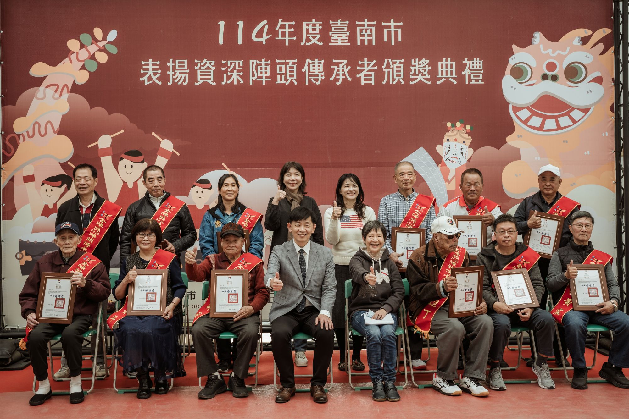 臺南市政府為深化陣頭文化保存與傳承,延續前(113)年訂定之《臺南市政府文化局表揚資深陣頭傳承者作業要點》,持續受理民眾提報長期投入陣頭文化之教練。經推薦與審查程序,於去年(114)度遴選出十二位長年耕耘藝陣、深具代表性的資深教練,今年於頒獎典禮中公開表揚,由副市長葉澤山出席頒獎,肯定教練們多年來默默付出、薪火相傳的文化貢獻。