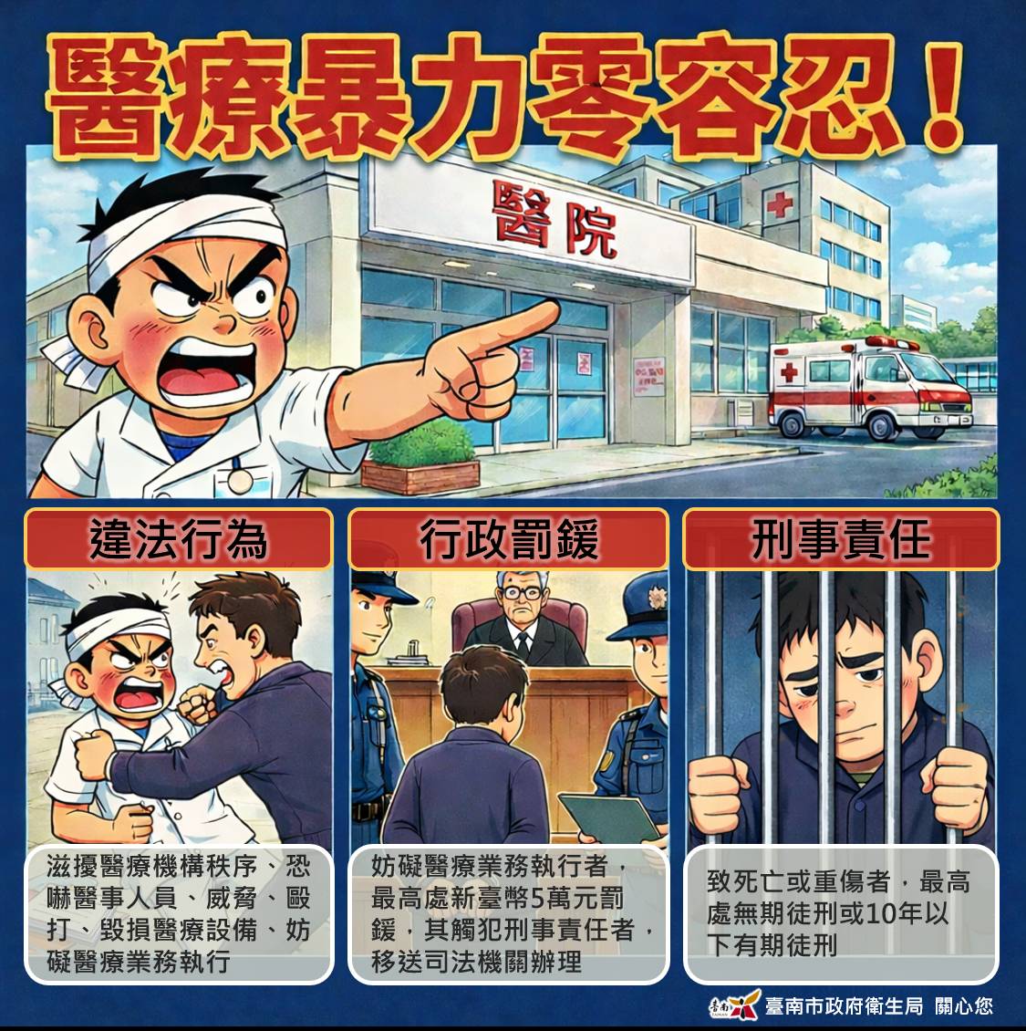 醫療機構是守護民眾生命健康的神聖殿堂,醫事人員更是在第一線與病魔搏鬥的英雄。然而,過往發生的醫療暴力事件,不僅傷害了醫護同仁的身心健康,更嚴重干擾正常的醫療秩序與患者服務。臺南市政府衛生局重申,對於任何形式的醫療暴力絕對秉持「零容忍」態度。