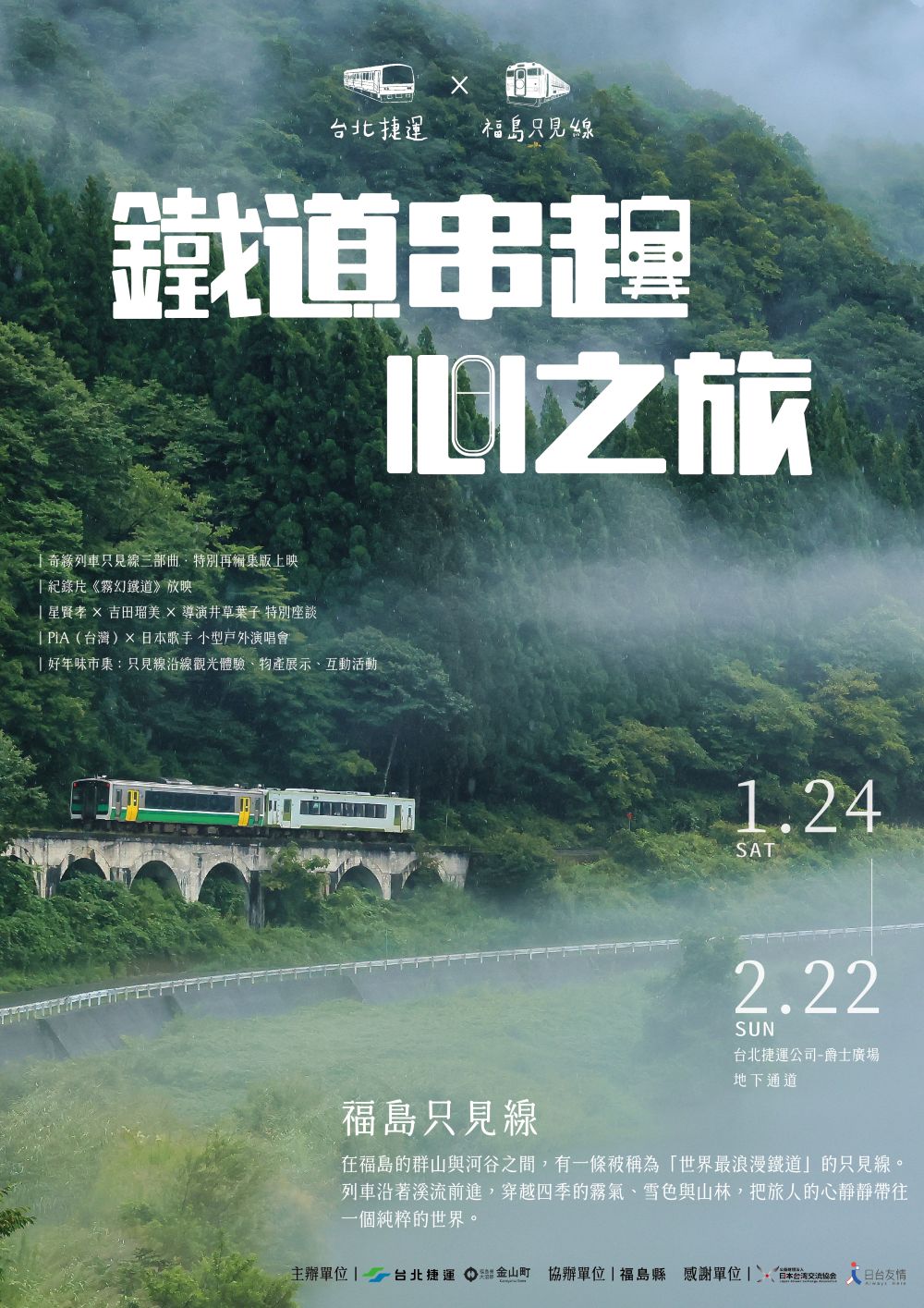 1月24日、25日,分別於爵士廣場草皮區邀請臺灣歌手PiA吳蓓雅及日本歌手伊東洋平,進行一連串精采演出;1月24日10時至下午5時間,捷運展演廳有電影放映會及賞析對談活動,且播放福島縣金山町只見線「奇縁列車 只見線三部曲」、「霧幻鐵道」影片,領略四季自然風光、體驗日本鐵道文化及了解地方創生經驗,親身感受特有魅力。
