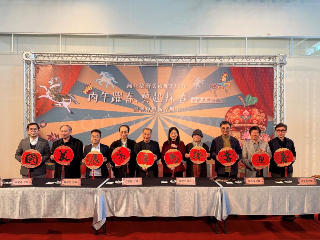 國美館今日舉辦新春開筆活動,由國美館長陳貺怡及李轂摩、施春茂、陳欽忠、林榮森、蕭世瓊、陳志聲、張志鴻、林俊臣、許志芳等9位知名書法家現場開筆祝福斗方,並現場揮毫祝賀春聯,傳遞馬年的期許祝福。同時發送名家墨寶印製春聯,分別是國寶書畫家李轂摩、114年全國美術展書法類金牌獎許志芳之墨寶,供民眾限量索取。