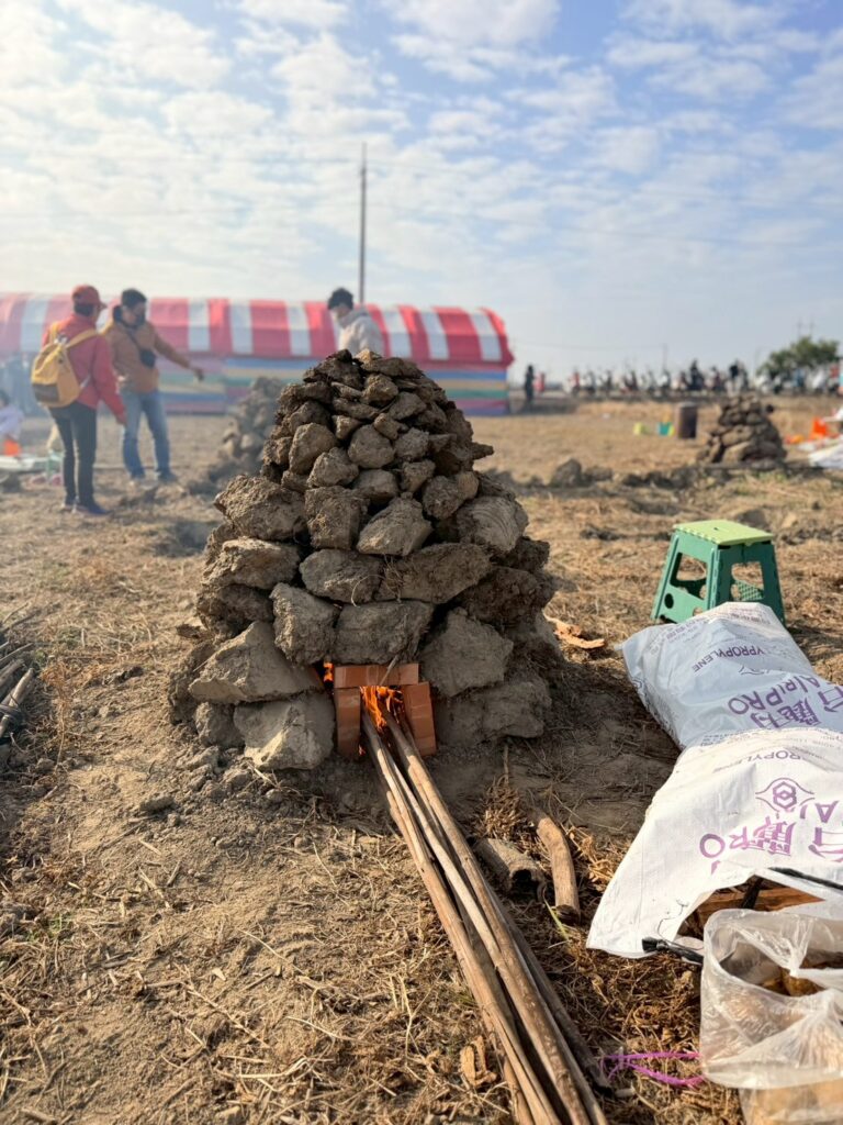 隨著柴火的加溫,土窯土塊逐漸轉變成橙黃色,透露著可以將食材放入土窯的訊息,趁著等待開窯的空檔,小朋友在會場旁的遊戲區玩起射飛機,一旁的稻草捲區,吸引大朋友拍照扮起網紅,還有許多家長搭起歐帳或者席地而坐,享受著冬日暖陽,歡樂的場面加上慵懶的享受,重現農村農忙後的悠閒時光。