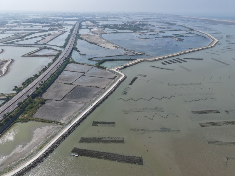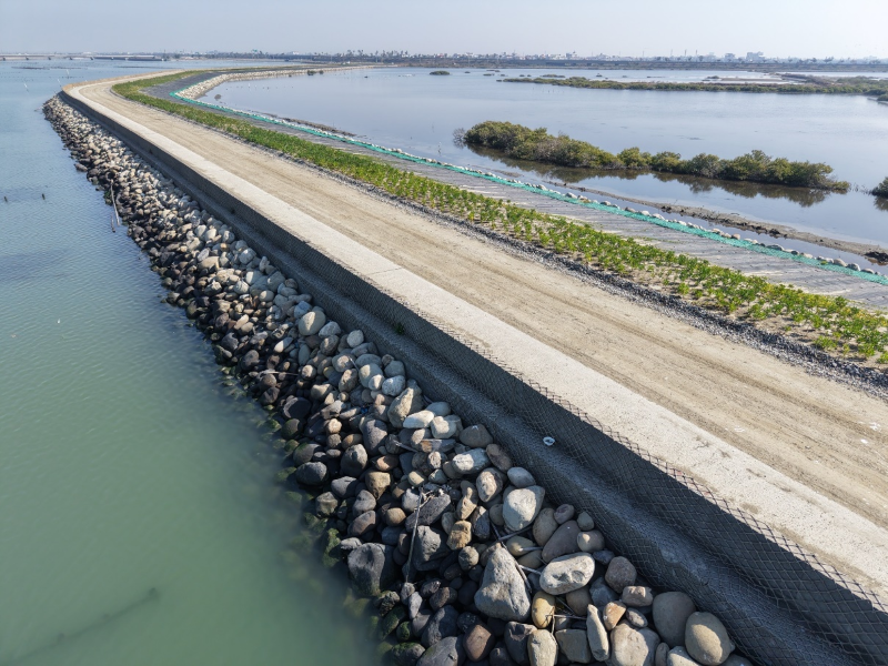 水利局補充,本工程在規劃設計階段即導入多項生態與低碳理念,減少混凝土使用,改以天然材料施作,整體工程碳排量相較傳統工法降低近九成。未來透過補植海桐、苦檻藍、馬鞍藤等原生濱海植物,持續復育濕地植生,並結合拋石工法營造多孔隙棲地環境,可望達成防洪安全、濕地生態與親水環境共融的多重效益。