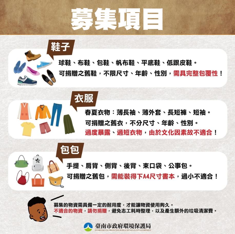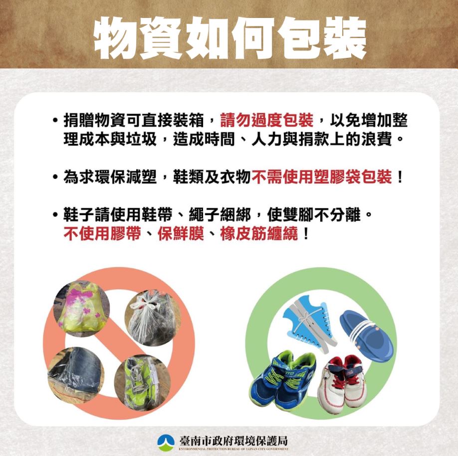 環保局提醒,捐贈物資請事先清潔整理並確認堪用,並於活動期間親自送達。歡迎大家一起參與「舊鞋救命-臺南募集活動」,讓物品再生、讓愛延續。