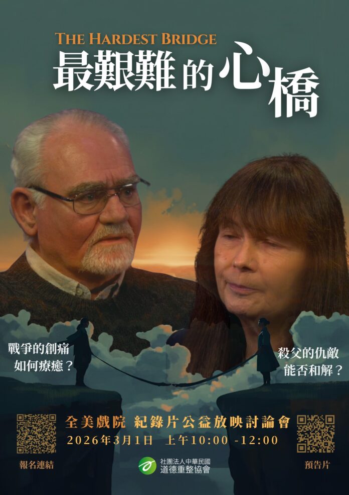 社團法人中華民國道德重整協會迎來成立35週年,特別於115年3月1日(星期日)上午10時至12時,在台南全美戲院舉辦英國紀錄片《The Hardest Bridge 最艱難的心橋》放映暨交流活動,邀請社會大眾透過真實影像,一同思考和平的起點。
