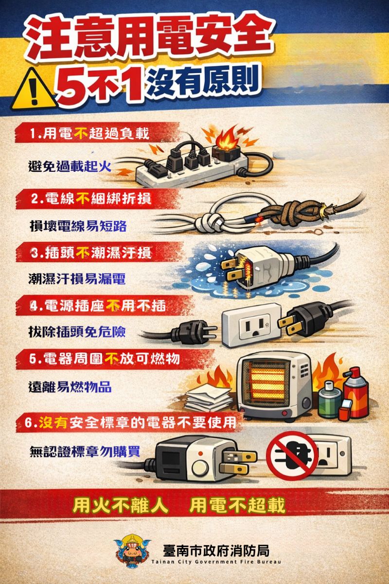 依據南市府消防局統計,115年至今之住宅火災件數為21件,其中電氣因素起火為14件,占66.67%,經分析起火原因,多與用火用電不當及居家環境堆積雜物有關。為防範類似事故再度發生,冬季天氣寒冷,天乾物燥火源使用驟增,消防局特別呼籲市民朋友提高警覺,落實用火、用電安全,並保持居家環境整潔,避免雜物堆積,降低火災風險。