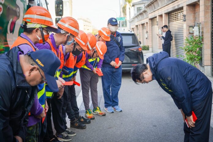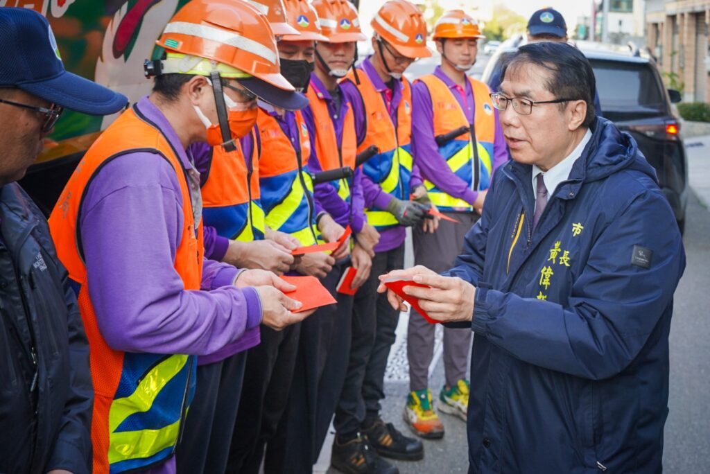 黃偉哲市長10日下午分別到東區及南區兩處垃圾收運點,發紅包給清潔隊員並拜早年。正在執行清運工作中的清潔隊員,領到市長發放的新春紅包都相當開心,視為新春好采頭。