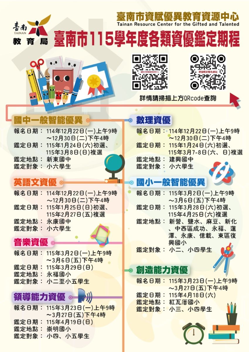 臺南市國小資優鑑定將於春節假期後正式啟動!為提供資賦優異學生最適切的教育環境,臺南市政府教育局每年定期辦理資優鑑定,115學年度國小一般智能優異及音樂資優學生鑑定報名時間,自115年3月2日(星期一)上午9時起至3月6日(星期五)下午4時止;國小創造能力及領導能力資優學生鑑定報名,則訂於115年3月23日(星期一)上午9時起至3月27日(星期五)下午4時止,南市教育局誠摯歡迎符合資格的學童踴躍參與!