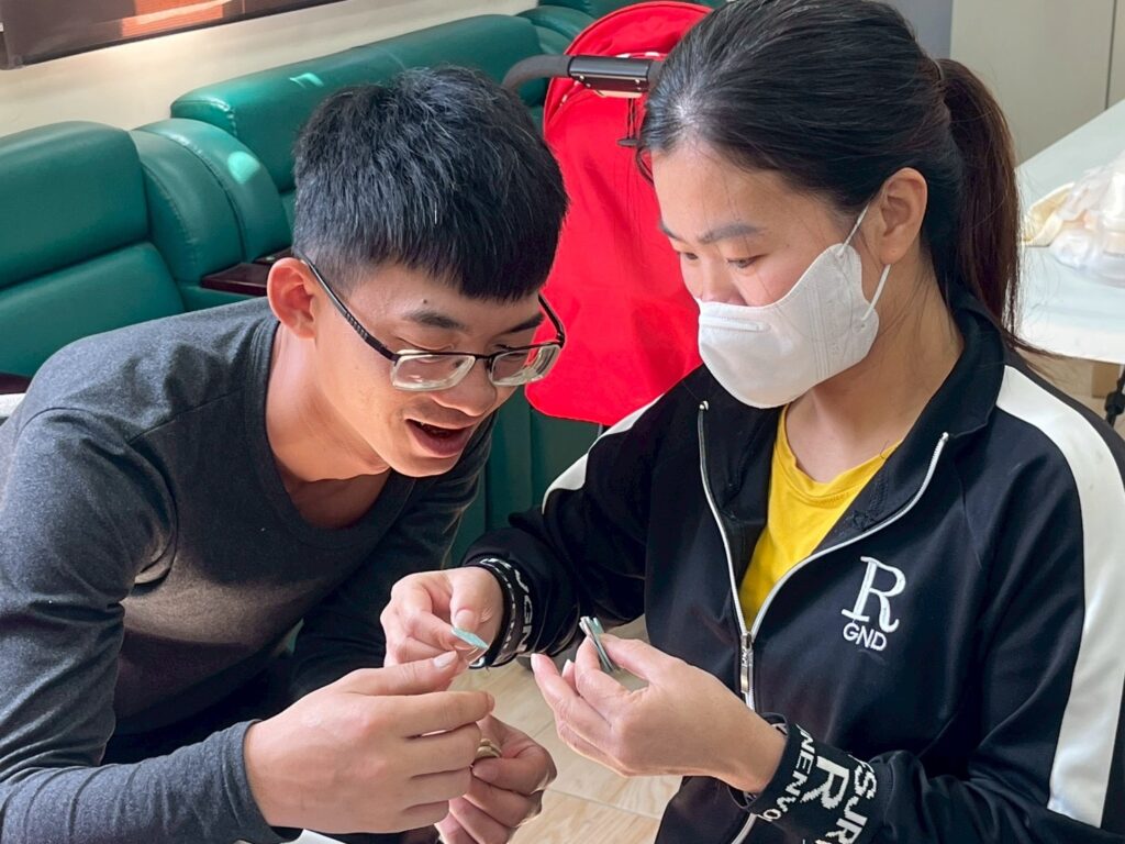 在體驗製作「金馬報喜」福袋鑰匙圈環節中,新住民夫妻需不斷穿引蠟線、溝通合作,象徵好運奔騰的皮雕方能縫製得整齊美觀;正如柴米油鹽間的平凡歲月,唯有尊重與包容,關係才能穩固長久。接著,在飽滿的馬腹中放入新年祈願紙條,鎖住幸福。劉娟形容,「經營婚姻就像這皮革,需要細心的縫合,才能將兩個靈魂緊緊扣在一起。」