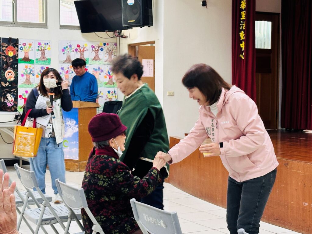 市長夫人劉育菁老師關心據點長輩來據點參與活動感受與互動。