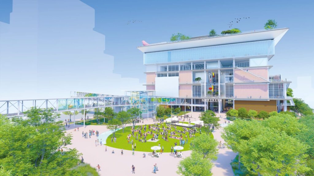 新板特區以「超級浩市達(SUPER HOPSCA)」作為整體發展願景藍圖,強調高運量交通、商務辦公、購物娛樂、公共開放空間與行政服務等機能整合,透過空橋系統與立體動線串聯城市各項核心設施,打造高度整合的都市生活圈。此次國家兒童未來館之推動,不僅補強公共文化與親子友善服務機能,更讓十餘年前提出的整合型城市藍圖逐步走入市民日常生活,使新板特區由構想邁向具體生活實景。