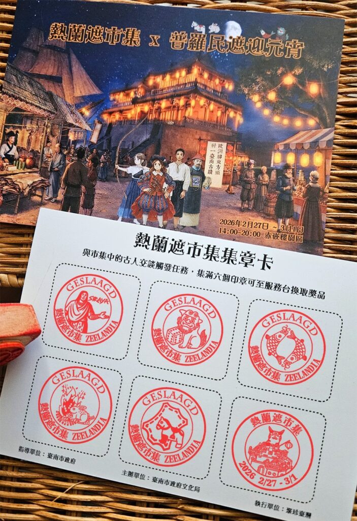延續市集傳統,今年同樣推出集章挑戰與走街展演。參與者只要找到6位歷史角色關主並完成指定任務,即可獲得「熱蘭遮市集經典角色尪仔標」1枚。本次印章圖樣更融入臺南人氣吉祥物 巷仔Niau,以及全新設計的「赤嵌樓的動物夥伴們」,增添收藏趣味。走街展演則由阿伯樂戲工場專業演員擔綱,化身歷史人物,從赤嵌樓一路行至 大天后宮,透過戲劇與故事演繹,將節慶團圓氛圍延伸至街區巷弄。