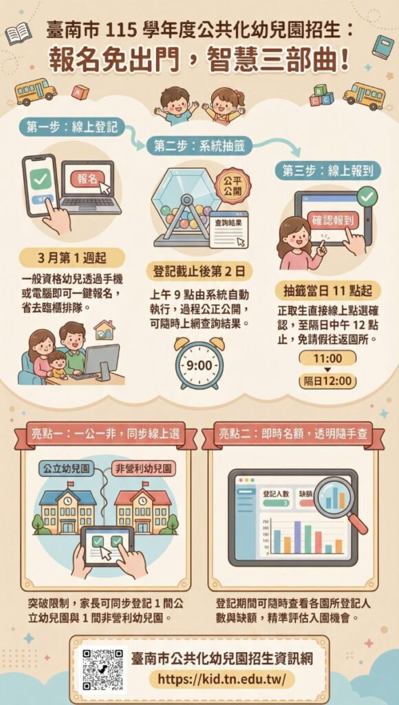 為簡化幼兒園報名流程、提升招生作業的透明度與公正性,臺南市政府教育局自115學年度起正式啟用全新改版的「臺南市公共化幼兒園招生資訊網」(網址:https://kid.tn.edu.tw/),全面導入線上登記、系統抽籤及線上報到三大智慧功能,並於3月初啟動招生作業。其中,設籍本市且無須另行檢附證明文件之一般入園資格幼兒,家長只需透過手機或電腦,即可輕鬆完成報名程序。