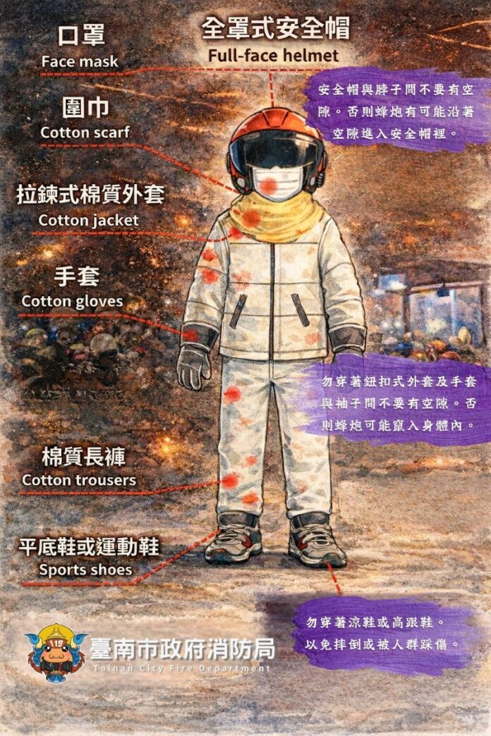 消防局長楊宗林呼籲,參與元宵節民俗活動的民眾務必注意自身安全,在此特別加強宣導,為了安全起見須裝備齊全,應戴上全罩式安全帽,並穿著高領束袖棉質厚上衣,下擺紮入褲子,避免鈕扣式上衣,脖子部分以圍巾包住,以免蜂炮由空隙進入,另戴上厚質棉紗手套,腳部束口式棉質厚褲子,厚質棉襪,高筒、厚底安全鞋並戴口罩,阻隔蜂炮造成之懸浮微粒。若嫌安全帽太悶熱,可以帽子、護目鏡、口罩替代,最高原則就是將全身緊緊包裹,儘量不要有任何部位曝露在外。相關防護裝備影片或圖片刊登於消防局網站宣導。