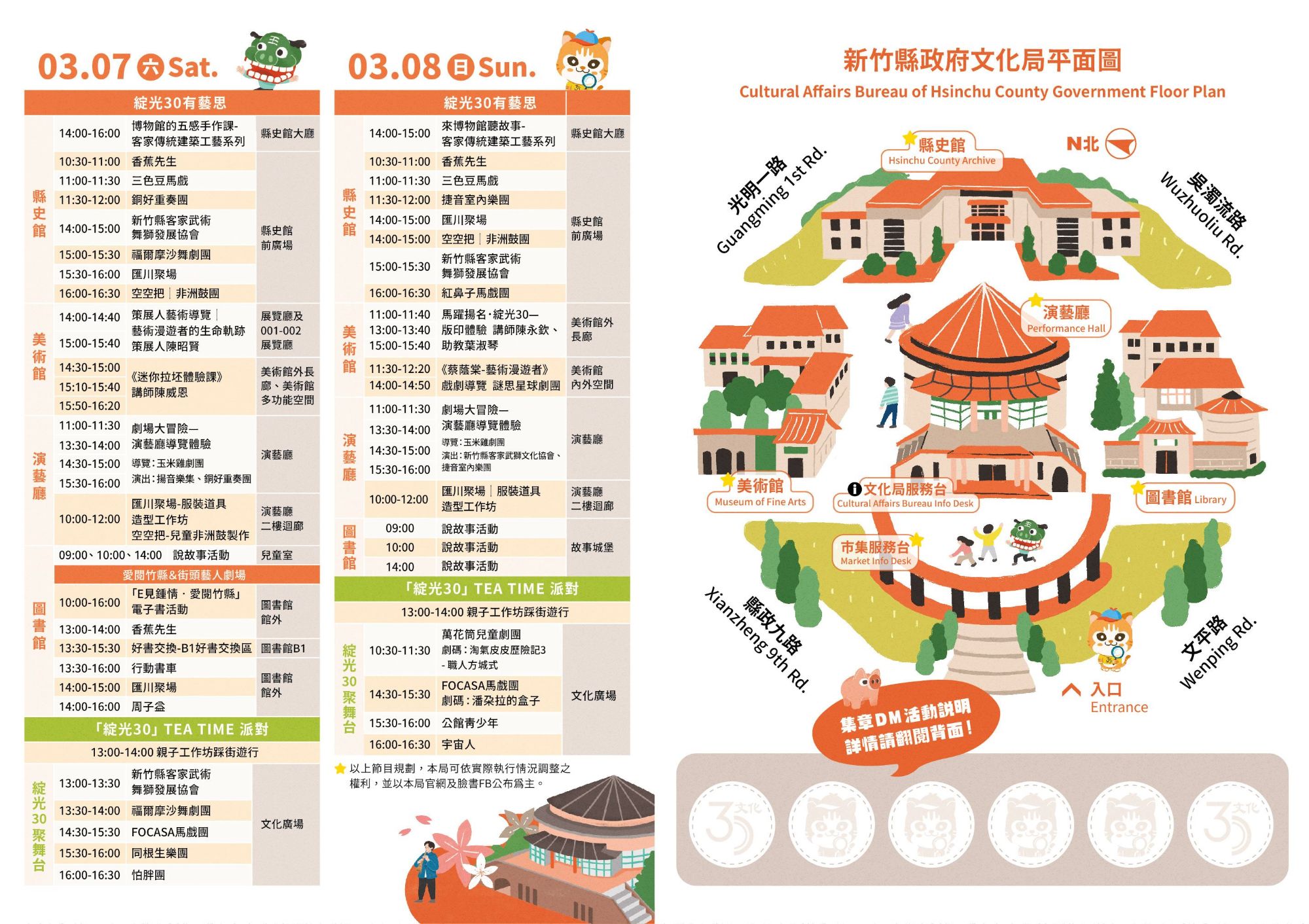 3月7日起一連兩天還有「綻光30有藝思」局慶系列活動於文化局園區登場,各館舍規劃多元創意導覽體驗、趣味集章闖關及藝文表演活動,園區並設置文創市集、迷你拉坯及版印等手作體驗,以及街頭藝人演出;文化廣場「綻光30」TEA TIME派對邀請宇宙人、怕胖團、同根生樂團、公館青少年及FOCASA馬戲團等優秀團隊輪番演出,活動豐富精采,邀請民眾前往一同歡慶文化局30週年。更多活動資訊請至新竹縣政府文化局官網查詢(https://hsinchucultural30.mystrikingly.com),並歡迎追蹤新竹縣政府文化局Facebook(https://www.facebook.com/hchcc.gov/)。