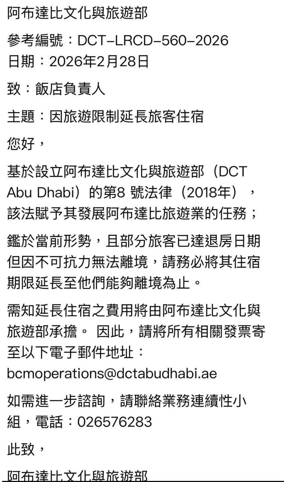 正在阿布達比隨旅行團旅遊的劉紫玲根據通告內容於臉書po文說,受影響旅客即使已達原訂退房日期,只要因不可抗力因素無法出境,飯店須配合延長其住宿。相關費用將由政府統一支付,業者僅需將發票寄送至指定電子郵件地址辦理核銷。如有進一步查詢事項,可聯繫業務連續性團隊。