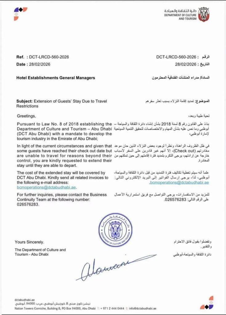 因中東局勢升溫導致區域航班大規模取消與延誤,阿拉伯聯合大公國首都阿布達比文化與旅遊部(DCT Abu Dhabi),發布正式通告,要求全市各飯店總經理協助延長因旅行限制而無法離境旅客的住宿期限,直至旅客能安全離開為止。台灣旅客接到此通告直說這個國家太霸氣了,所有延長住宿產生的費用將由該部門全額承擔,飯店不得向旅客收取額外費用。
