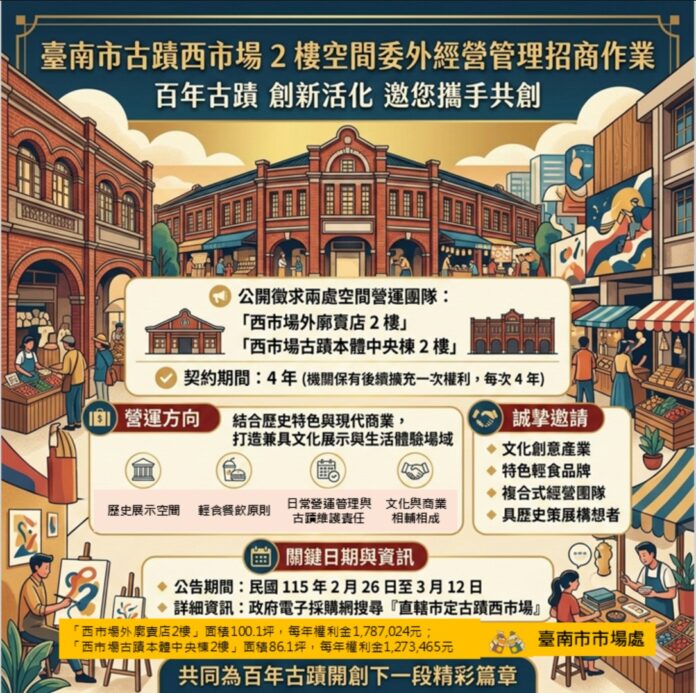 今年農曆春節期間,西市場湧現大量人潮,成為臺南最熱門景點。西市場緊鄰國華友愛商圈,商機蓬勃,展現古蹟活化結合觀光經濟的強大磁吸效應。為持續推動文化資產永續經營與空間加值利用,臺南市市場處正式公告辦理西市場古蹟2樓空間委外經營管理招商作業,公開徵求優質營運團隊進駐。本次招商空間:「西市場外廓賣店2樓」面積100.1坪,每年權利金1,787,024元;「西市場古蹟本體中央棟2樓」面積86.1坪,每年權利金1,273,465元。
