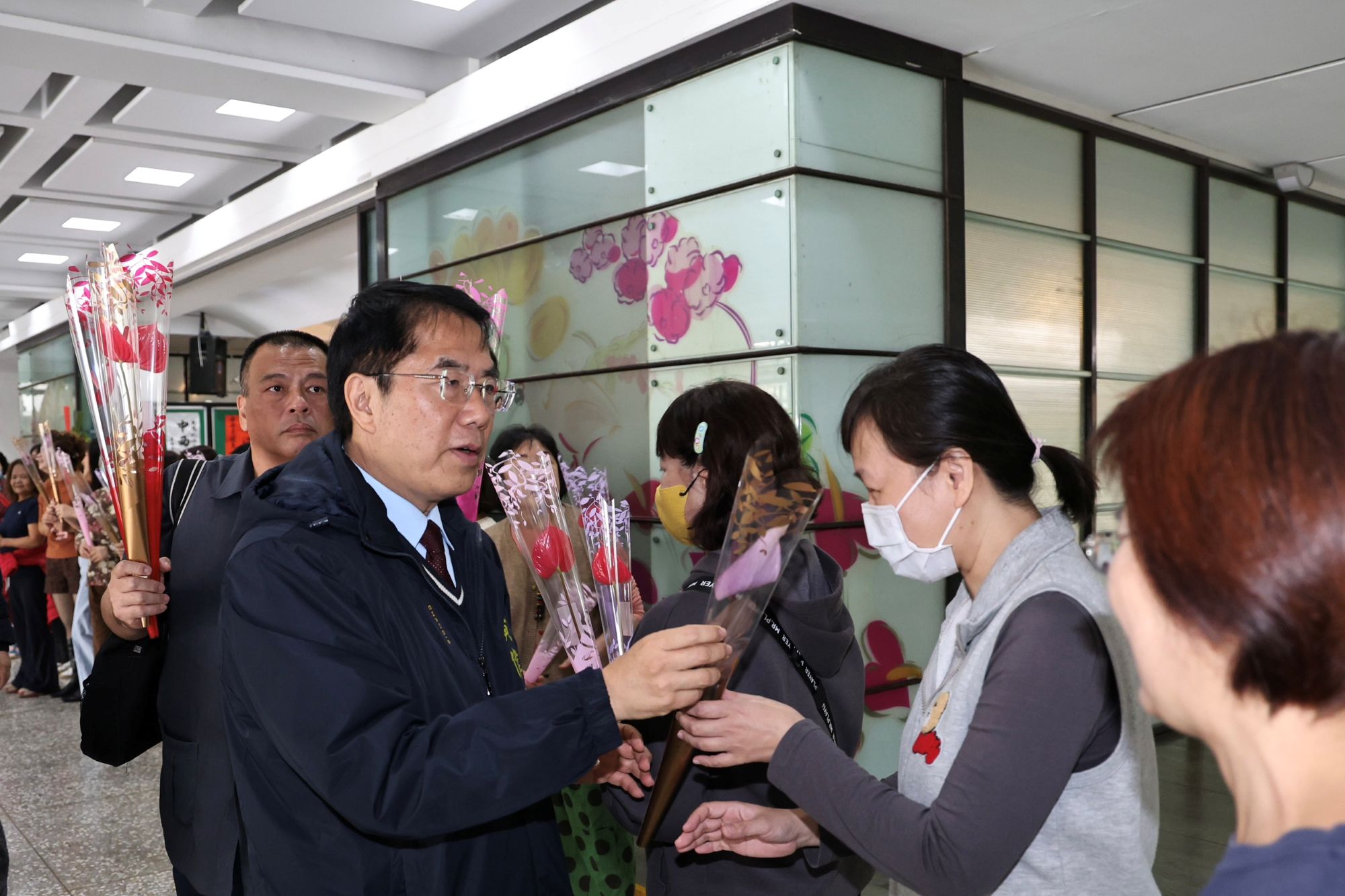 後天是3月8日國際婦女節,市長黃偉哲提前在6日分別於民治及永華市政中心贈送火鶴花給洽公女性民眾,對於在社會、家庭中努力付出的女性們,獻上最誠摯的敬意與祝福。