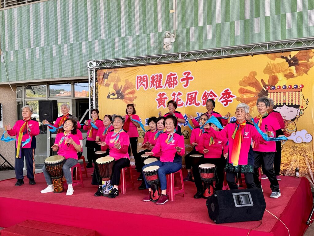 北屯區廍子里社區關懷據點婦女表演花鼓。(秦硯琪攝)