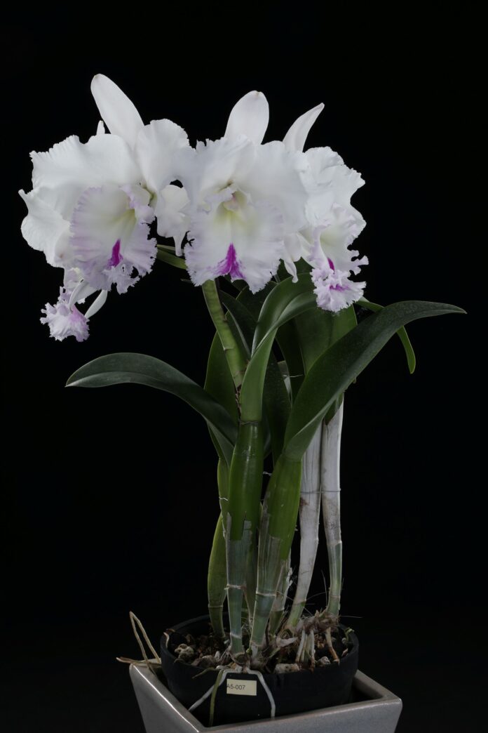 由杜氏蘭園培育之嘉德麗雅蘭白花個體,憑藉著一梗四朵、碩大開闊的花型脫穎而出。雪白瓣片與唇瓣邊緣的淡紫色暈染形成鮮明對比,兼具華麗大器與競賽標準,除獲分組冠軍外,更摘下金牌獎(GM)最高殊榮。