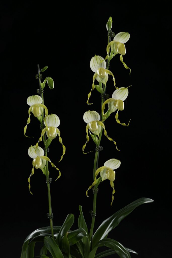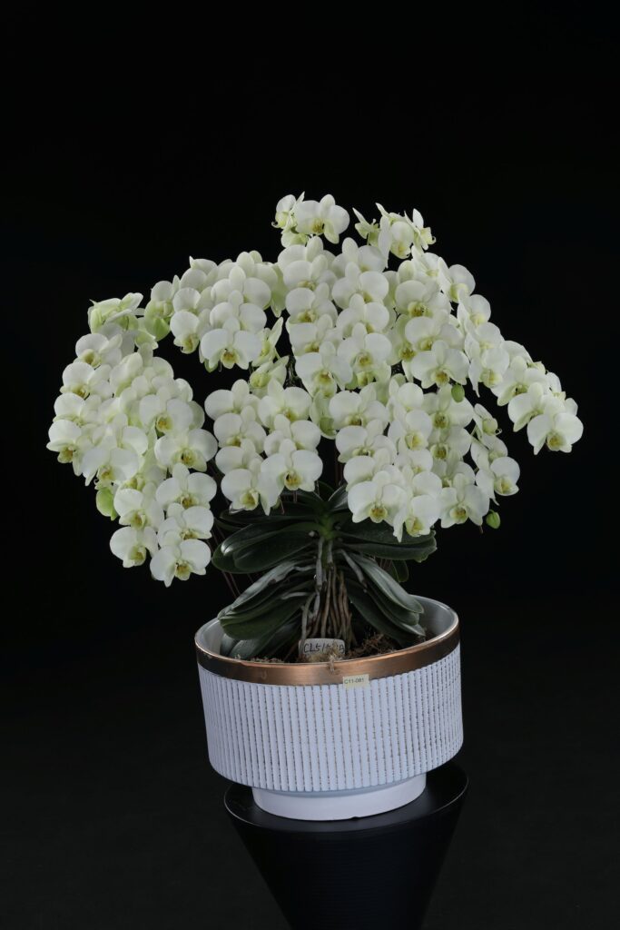 科隆公司選育的黃綠花蝴蝶蘭,結合「臺灣阿嬤」的優秀花型與 Phal. Heliodor 的碧綠色澤。單株加側芽共著生 10 支花梗、近百朵花同時綻放,形成壯觀的連續花瀑,展現量產型品系難得的高度一致性。