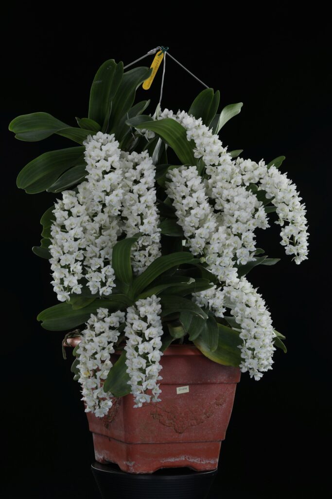 D組冠軍由吳文彬培育的 Rhy. gigantea 白花品系奪得。其花序密集成串、垂墜自然,潔白如雪的花色在光影下呈現通透質感。葉片厚實、株型穩健,完美詮釋了狐狸尾蘭特有的延伸氣勢。