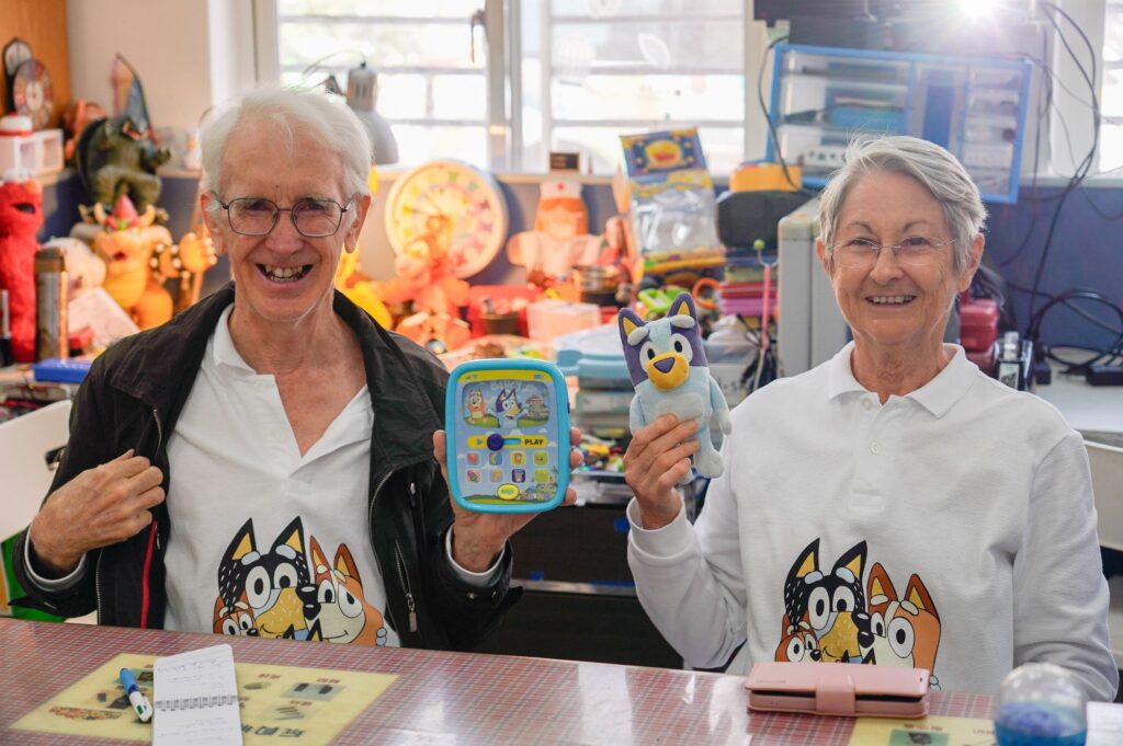 參訪團Robyn和 Steven Davis夫婦穿著澳洲《妙妙犬布麗》的T恤,由於這是澳洲著名的牧牛犬布麗動畫,國內也有引進節目,工作人員LuLu立即找來回收的布麗玩具,令兩人非常的開心。參訪團也穿起玩具銀行紅色的志工服,一起體驗回收、分類和整理。