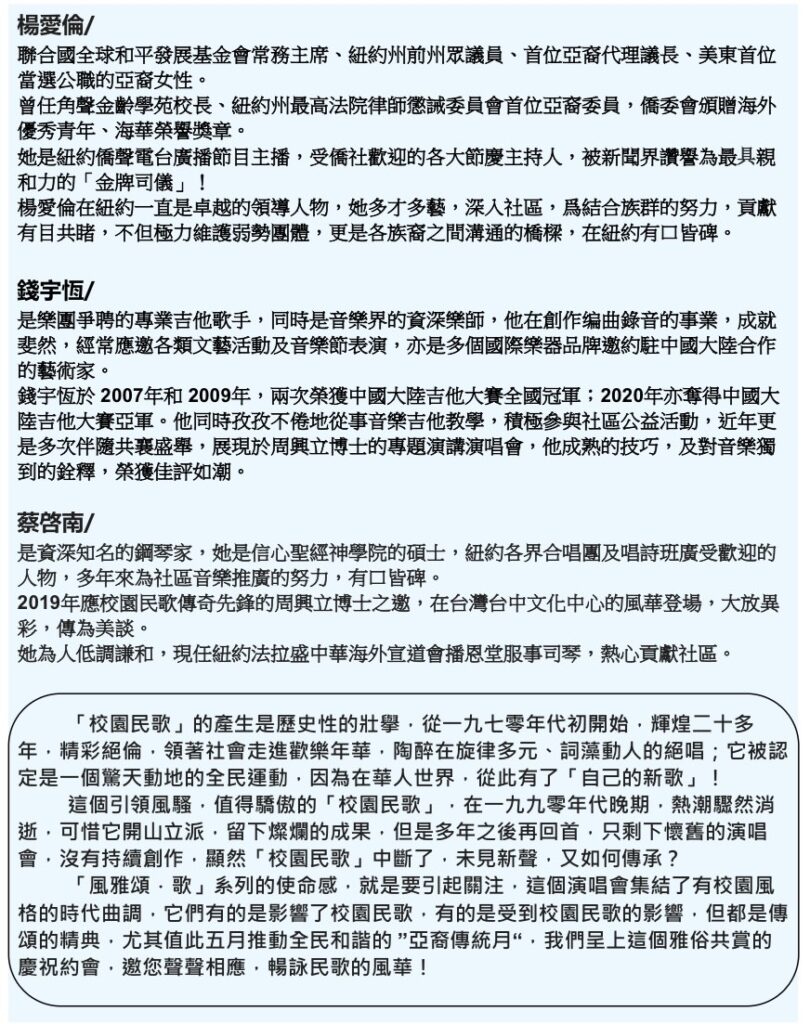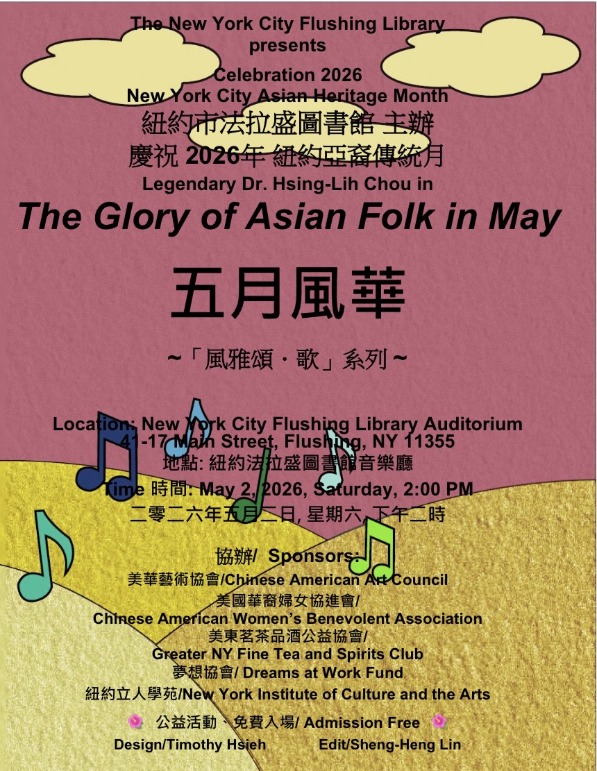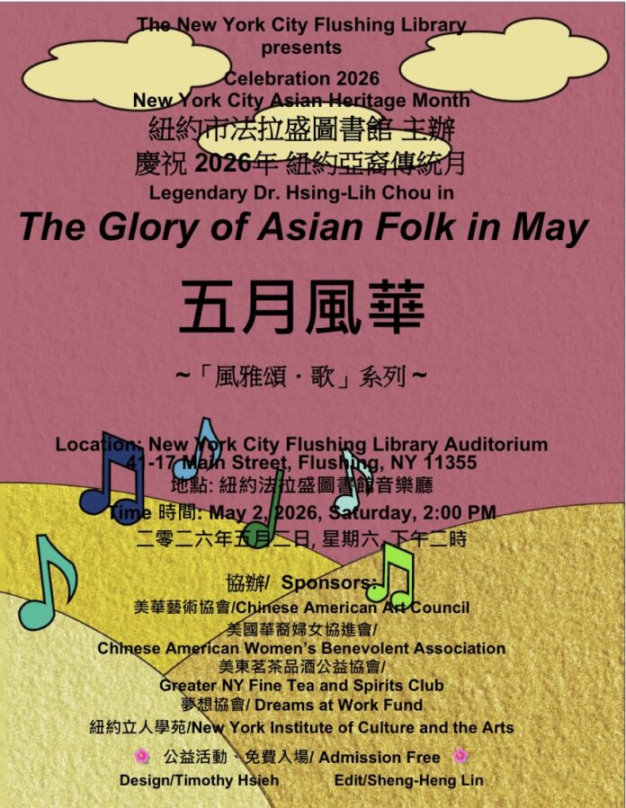 紐約市法拉盛圖書館慶祝2026年「亞裔傳統月」,特別推出「五月風華—風雅頌‧歌」民歌公益演唱會。