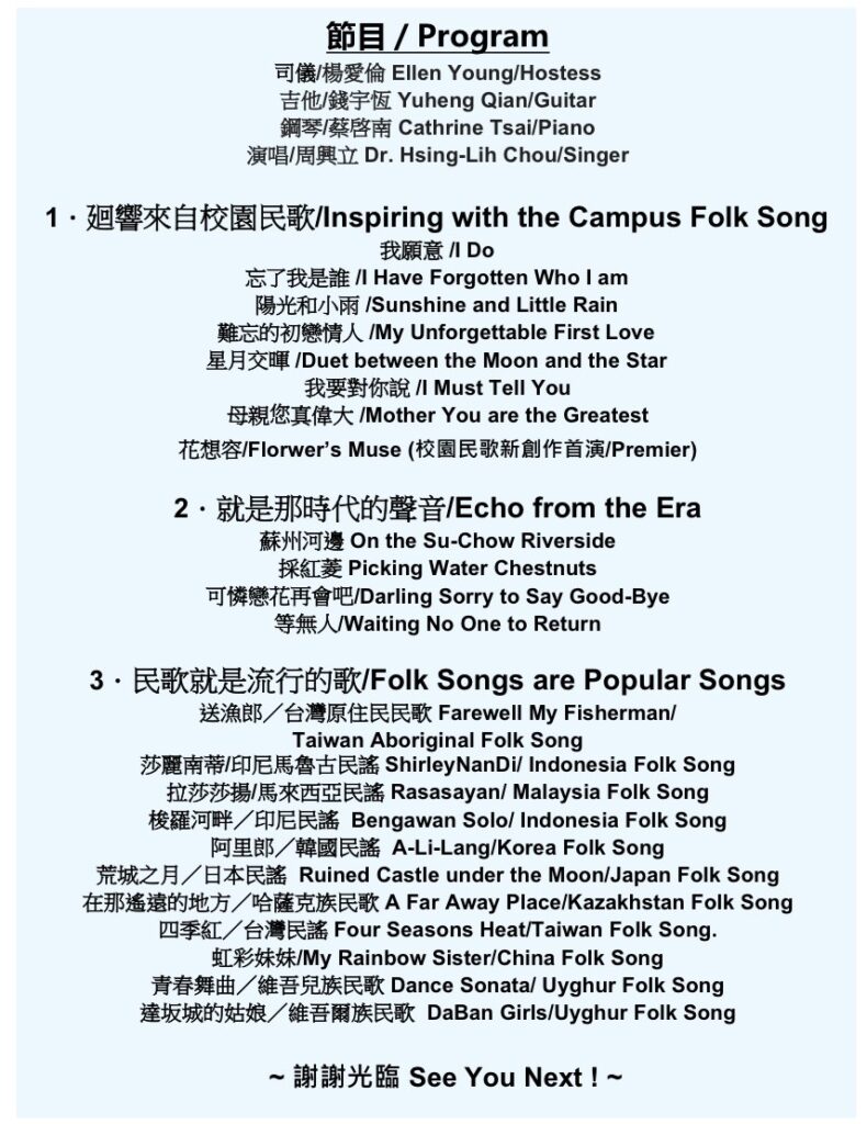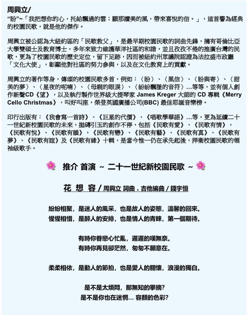 被譽為「大紐約民歌教父」的周興立博士,長年在美國推廣華人校園民歌文化,深受社區喜愛。本次受邀於法拉盛圖書館舉辦「五月風華—風雅頌‧歌」民歌公益演唱會,以經典民歌串聯世代記憶,展現亞裔文化風采,為紐約亞裔傳統月揭開溫馨序幕。