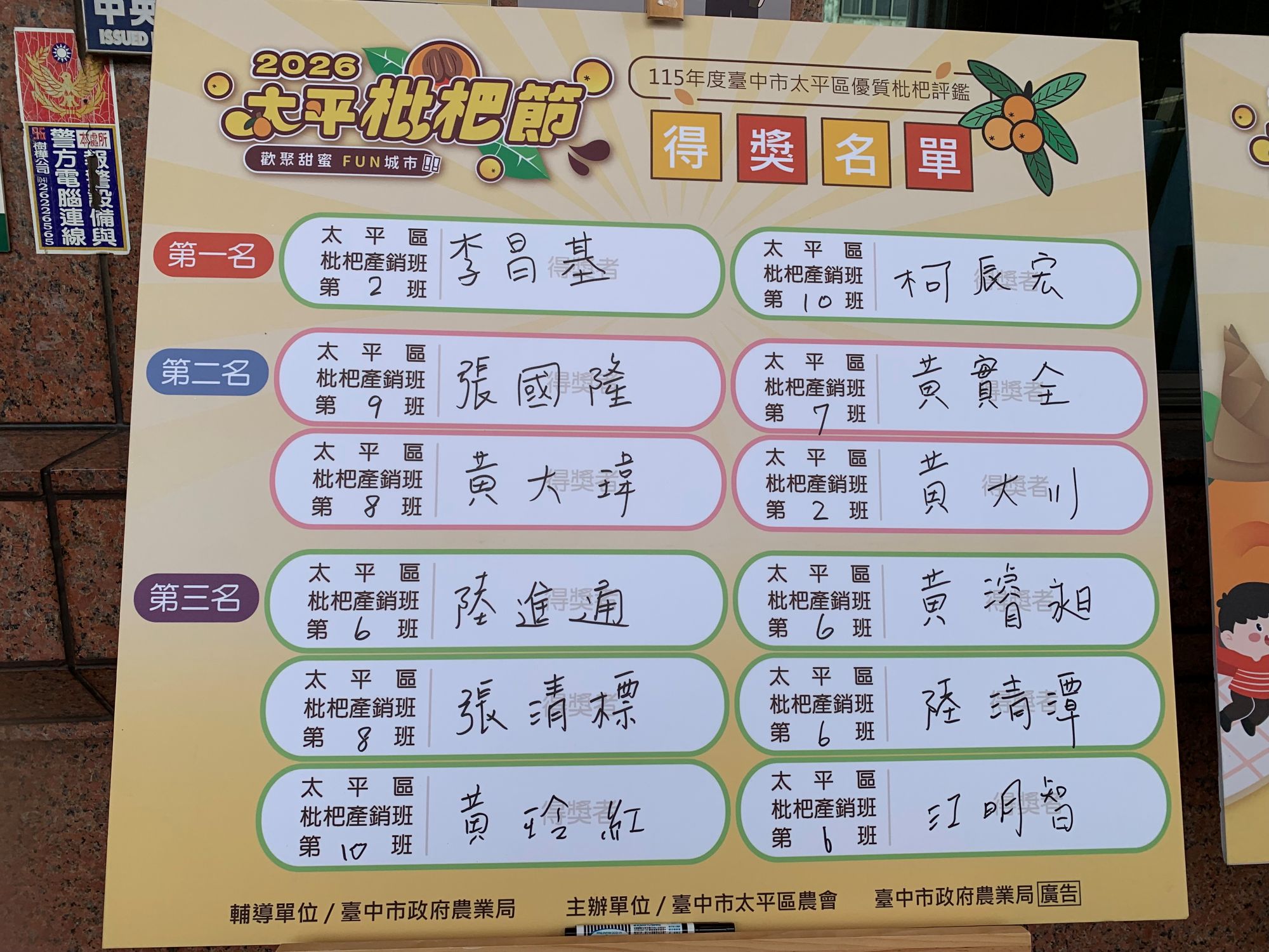 台中市優質枇杷再傳佳績!台中市政府農業局輔導太平區農會於26日舉辦「115年度台中市太平區優質枇杷評鑑活動」,透過專業評比選出年度優質果品,此次共有50組農友參賽,最終由李昌基及柯辰宏脫穎而出,榮獲「枇杷王」,展現台中枇杷高品質與農友精湛栽培技術。