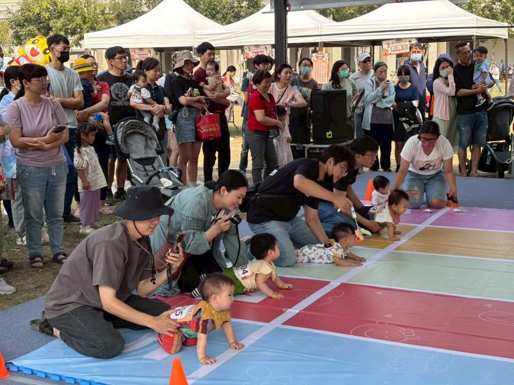 家長帶寶寶參加爬行比賽,現場歡笑聲不斷。