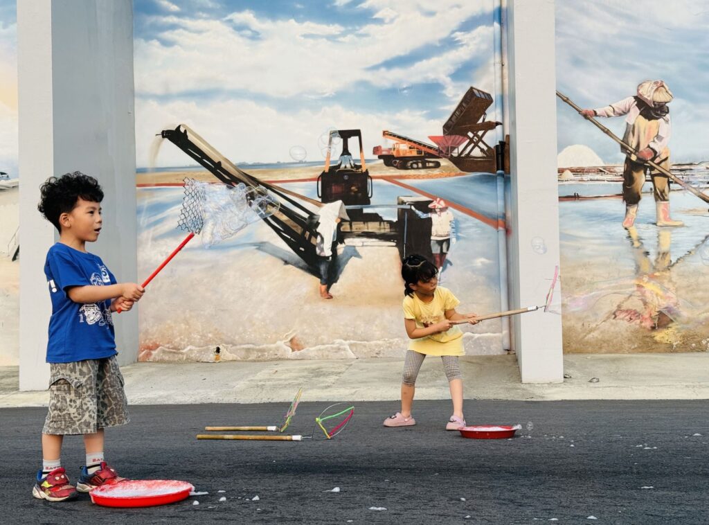佔地廣闊的七股鹽山,是親子戶外放電的最佳場域,本次活動特別企劃「大地彩繪塗鴉」,遊客只需完成社群平台打卡追蹤,即可免費領取彩色粉筆。孩子們能以大地為畫布,盡情揮灑創意,堆疊出春天的繽紛色彩。此外,園區祭出超值同樂回饋,凡於門市單筆消費滿199元,即可獲贈「泡泡體驗券」一張,讓孩子在藍天與鹽山的襯托下追逐飛舞泡泡,享受戶外樂趣。