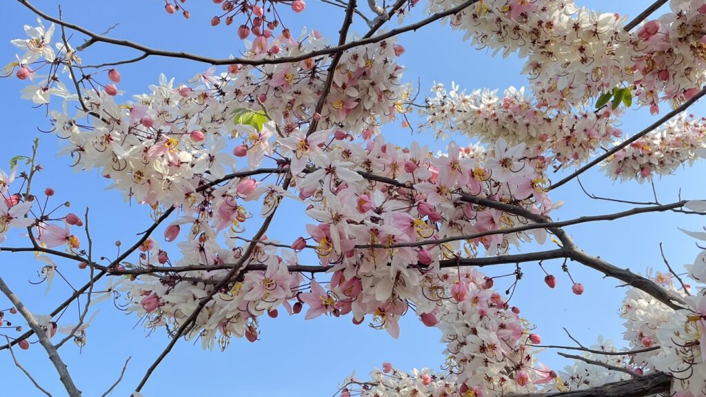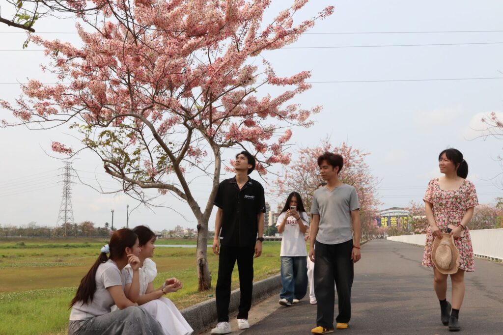 中華醫大與仁德滯洪池相鄰,師生自願擔起即時花況的分享任務,緊盯仁德滯洪池花旗木花開的時程。得知滯洪池的花旗木已爆開,師生利用下課或放學時間,相偕前往賞花,看著串串粉紅花朵迎風搖曳,美麗的花景為大家帶來身心療癒,一路拍照一路閒話家常,大家開心不已。