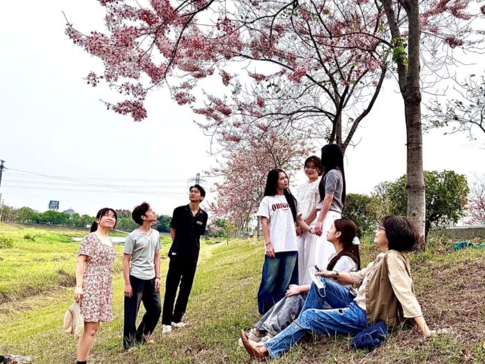 位於中華醫大旁的仁德滯洪池花旗木正盛開,師生佔地利之便就近賞花並分享賞花資訊。