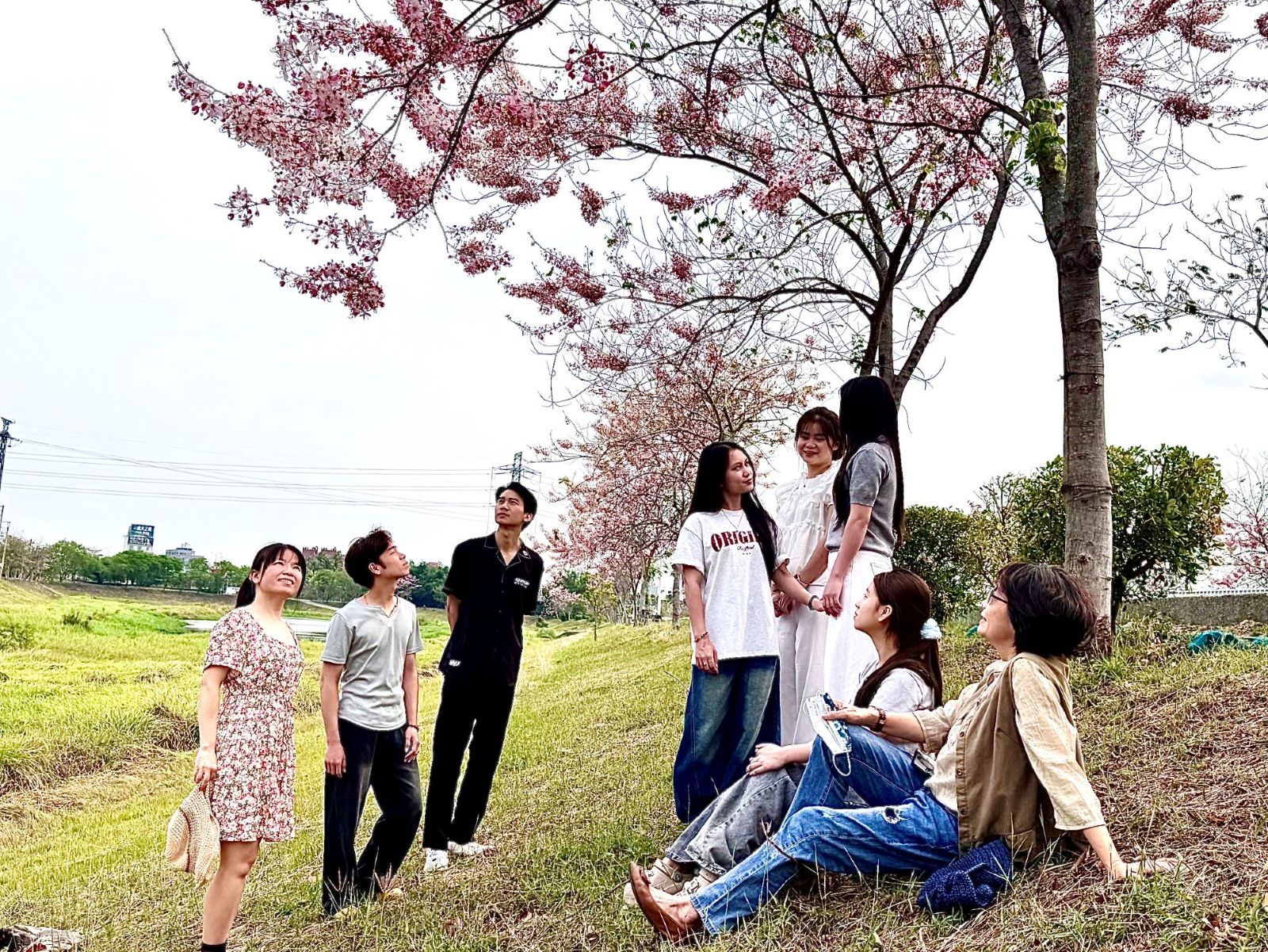 來自越南的視光系外籍學生,1日也利用課餘空檔邀老師一起前往滯洪池賞花拍照,看到花旗木和粉紅風鈴木盛開,扮起網紅拍照,說要分享在家鄉的家人和朋友。尤其是花旗木,主要種植在東南亞的緬甸和泰國,沒想到在華醫校園旁邊就可以看到這麼多花開美景,感到特別開心。