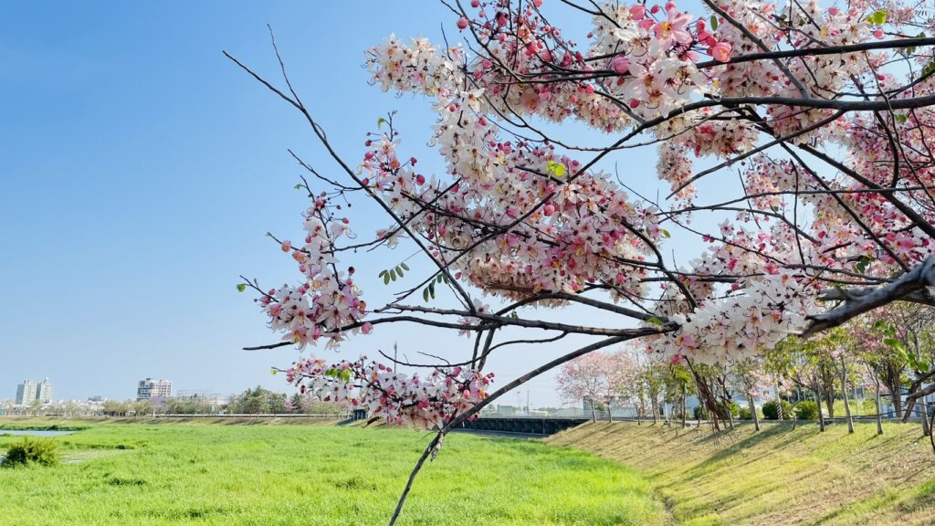 中華醫大旁的仁德滯洪池沿岸種有紅花風鈴木和花旗木,是台南市熱門的賞花景點之一。