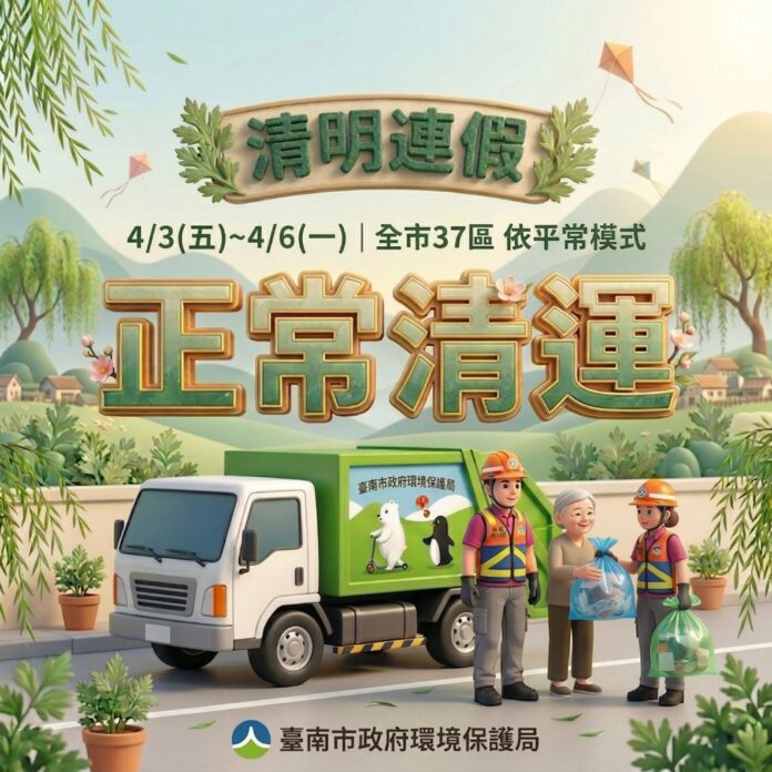 清明連假將至,為維護市容整潔與環境品質,南市連假期間垃圾清運維持「正常收運」,請民眾依照原定時間與地點配合清運作業。