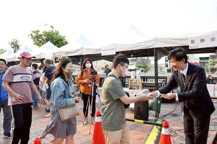 副市長葉澤山3日代表市長黃偉哲出席在安平運河畔推出的「大員盛場」市集,現場發放限量「即享券」,吸引民眾踴躍排隊領取。