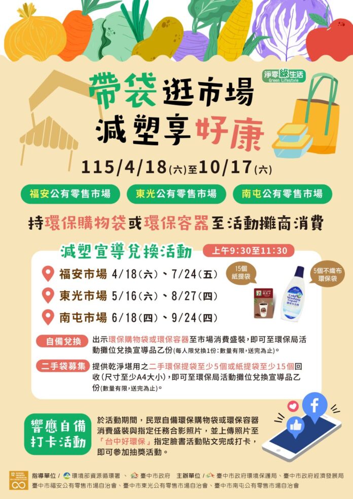 環保局提醒,巡迴設攤活動計6場次、每場次上午9時30分至11時30分止,分別為福安公有零售市場2場次(4月18日及7月24日)、東光公有零售市場2場次(5月16日及8月27日)及南屯公有零售市場2場次(6月18日及9月24日);活動當日民眾若自備環保袋或環保容器至市場消費盛裝,或捐出家中閒置乾淨堪用二手環保提袋或紙提袋(至少A4大小),即可至環保局設攤處兌換限量宣導品。