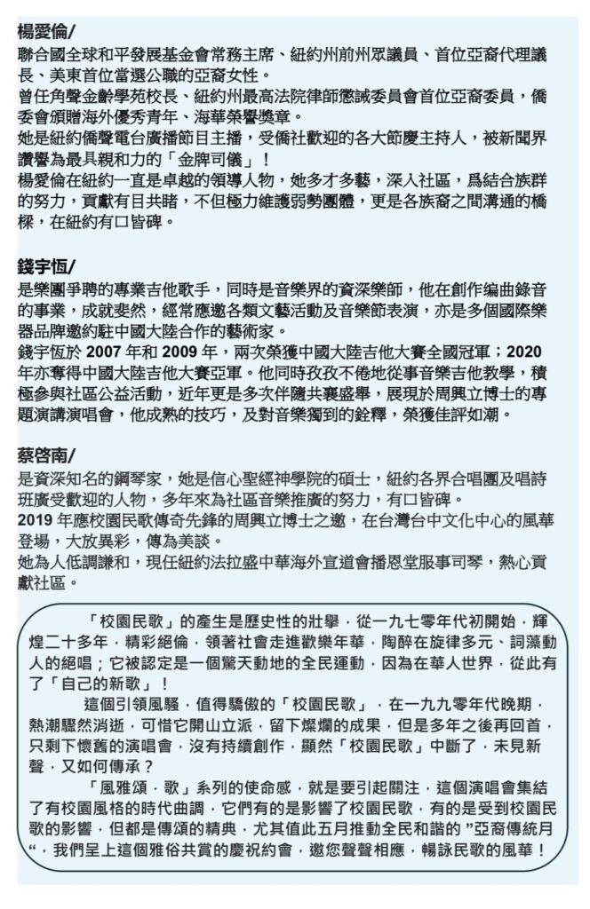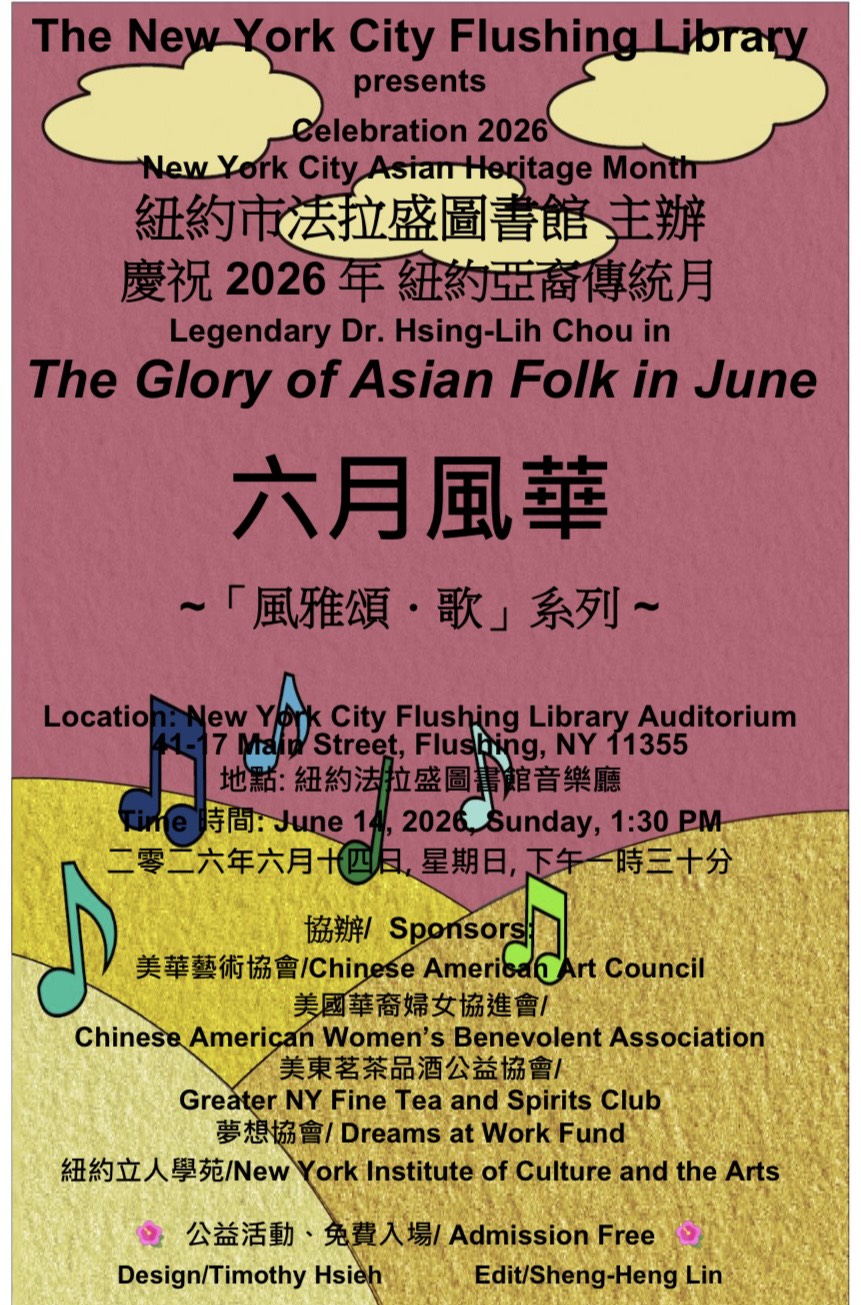 紐約市法拉盛圖書館慶祝2026年「亞裔傳統月」,特別推出「六月風華—風雅頌‧歌」民歌公益演唱會。