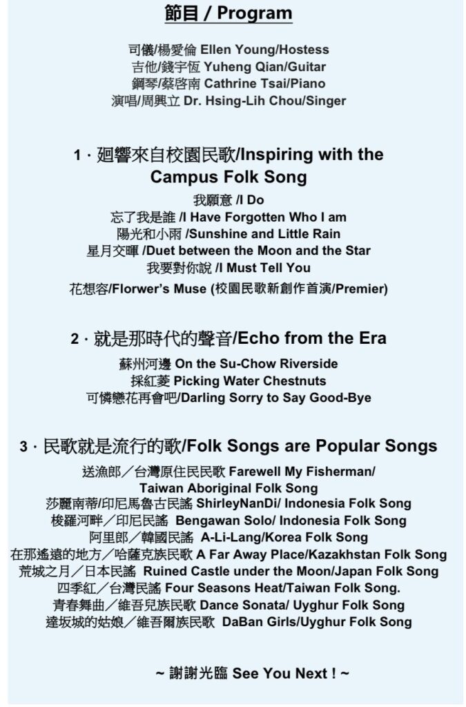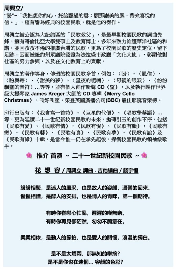 被譽為「大紐約民歌教父」的周興立博士,長年在美國推廣華人校園民歌文化,深受社區喜愛。本次受邀於法拉盛圖書館舉辦「六月風華—風雅頌‧歌」民歌公益演唱會,以經典民歌串聯世代記憶,展現亞裔文化風采,為紐約亞裔傳統月傳頌溫馨樂章。