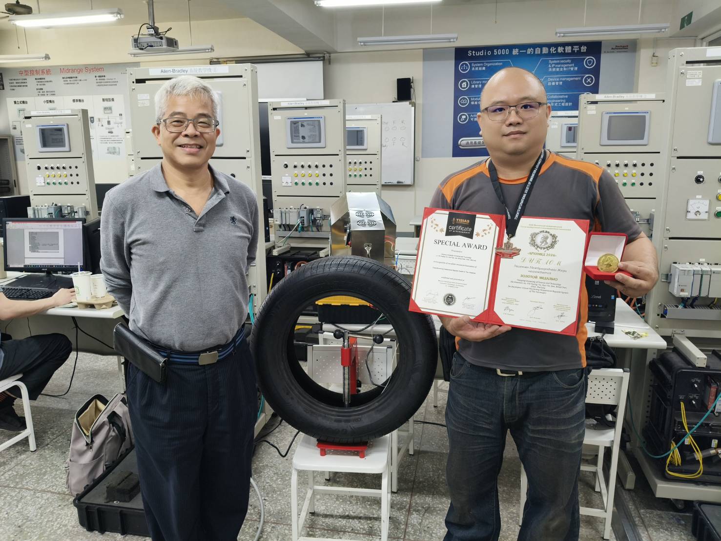 本次修平科大獲獎作品橫跨智慧製造、AIoT應用、綠能與運動科技等領域,展現跨系整合與實務應用的教學成果。其中,榮獲金牌及加拿大特別獎的「雲端監控輪胎火補機溫度調整系統」,由電機系呂奇璜老師指導何昆澤、簡邦宸、陳美玲同學研發,透過物聯網技術即時監控加熱盤溫度並自動調整,有效改善傳統修補過熱問題,提升作業安全與效率。