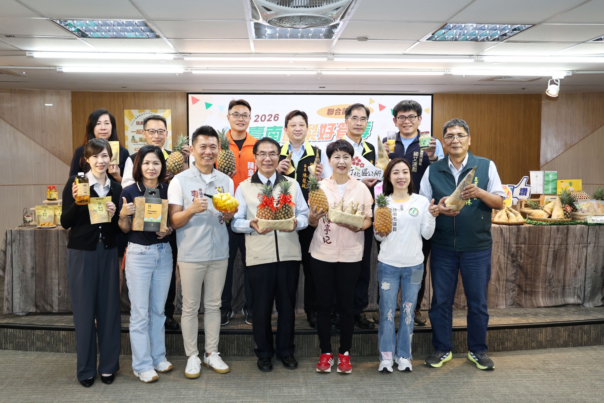 台南鳳梨與綠竹筍迎來盛產季,市府14日整合關廟、龍崎、新化三區,於永華市政中心舉辦「2026台南鳳梨好筍季」聯合行銷記者會,市長黃偉哲親自出席,預告首場市集活動將於4月25日在關廟山西宮登場,邀請民眾走入產區「食當季、吃在地」,品嘗最道地的台南風味。