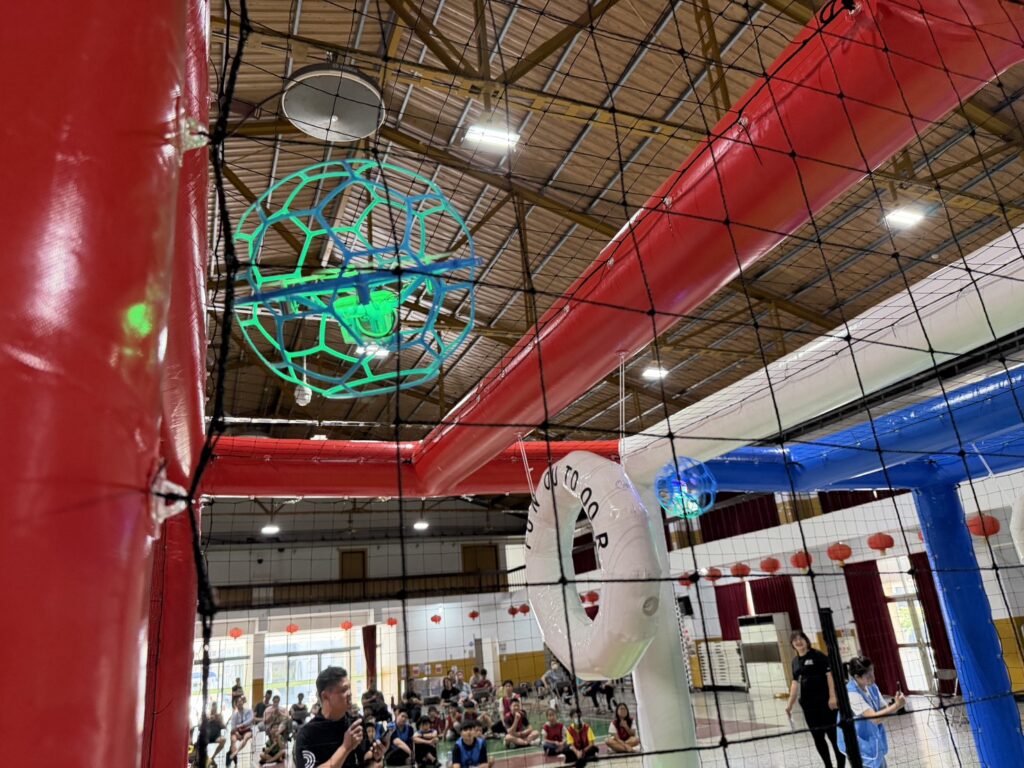 「無人機足球(Drone Soccer)」是一項結合無人機操控、電競節奏與團隊戰術的新興運動。將無人機裝在一個中空的碳纖維防護罩裡,無人機啟動時,成為一顆飛行的球體,在特製場地內進行攻防對抗。整體賽事節奏快速,搭配燈光效果,考驗操控技巧與團隊默契,被譽為「空中F1」或「現實版魁地奇」。