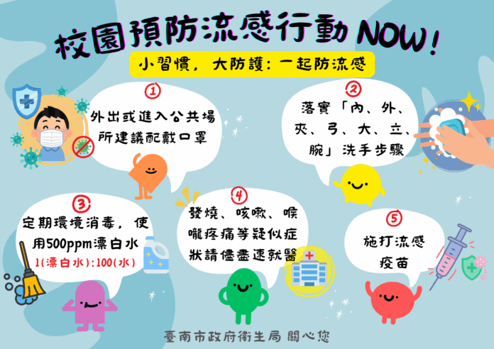 市長黃偉哲呼籲,民眾務必落實呼吸道衛生與咳嗽禮節,包含勤洗手、配合戴口罩、避免出入人潮擁擠場所,以及出現發燒、咳嗽等症狀應儘速就醫並在家休養,以降低傳播風險。市長同時提醒,高齡者、孕婦及慢性病患者等高風險族群,應儘早接種流感疫苗及新冠疫苗,透過雙重保護來降低重症及死亡風險,本府已規劃完善疫苗撥配與接種流程,符合資格的市民朋友,可透過「台南疫苗接種預約系統」完成登記(https://health-reservation.tainan.gov.tw/),或自10月1日起前往本市37區衛生所及合約院所接種。